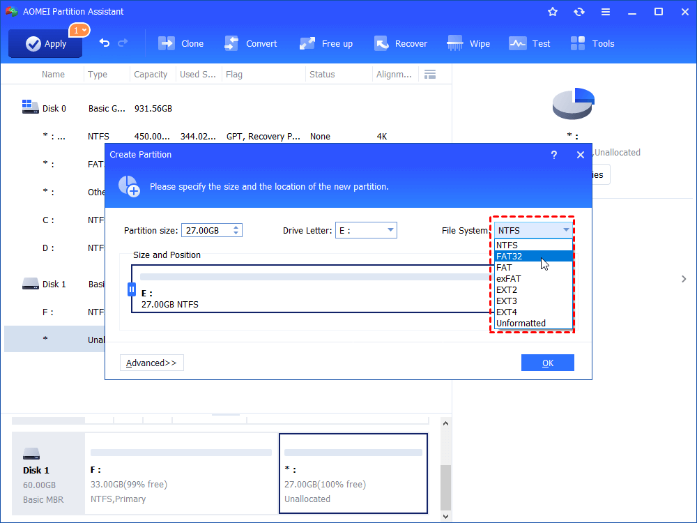 One thing should be noticed first that Xbox360/Xbox one can only read FAT32 file system. Normally, FAT32 can be converted to NTFS easily but not vice versa. If your HDD is NTFS, don’t worry. AOMEI Partition Assistant Standard also has the function to help you convert NTFS to FAT32. It breaks the limitation compared with Windows built-in Disk Management. With Disk Management, only the partition whose size is smaller than 32GB can be formatted from NTFS to FAT32.