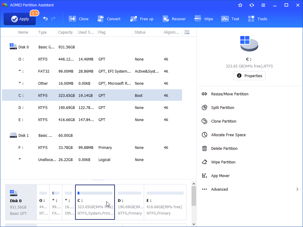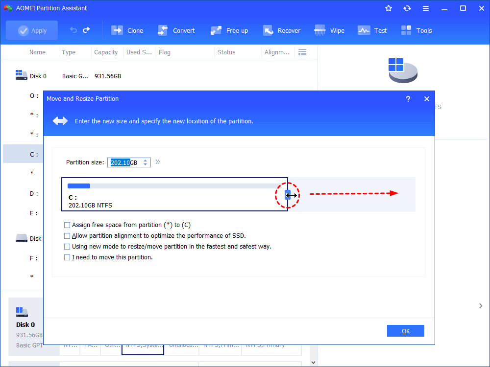 If you’re running system on SSD, partition alignment is supportive as well. In a nutshell, no matter what your hard drive partition layout is, this software will help you change partition size at will. Free download HDD partition resize software and have a try.
