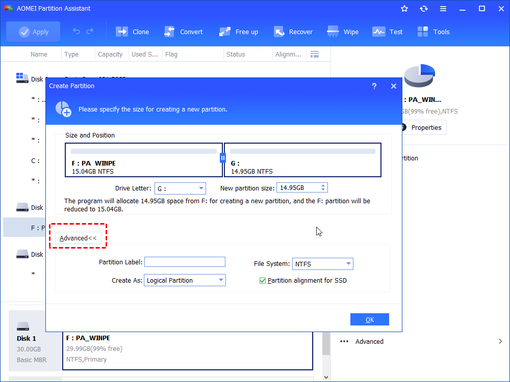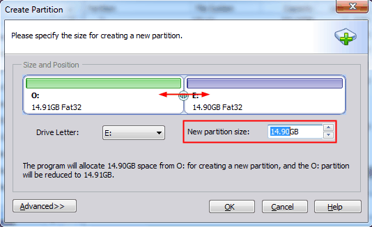 2. In the pop-up window, specify partition size through the double-head arrow or you can input the size manually. Drive letter could be ignored since it won’t be recognized by Windows.