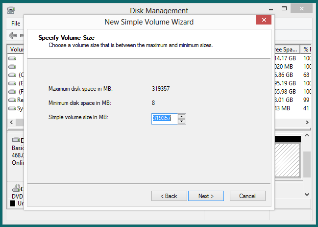 4. In the next screen, enter the volume size that you desire and Click “Next”. If you only want to use the space to create a single partition, you don’t need to enter the volume size and just click "Next", thus, it will maximum size by default.
