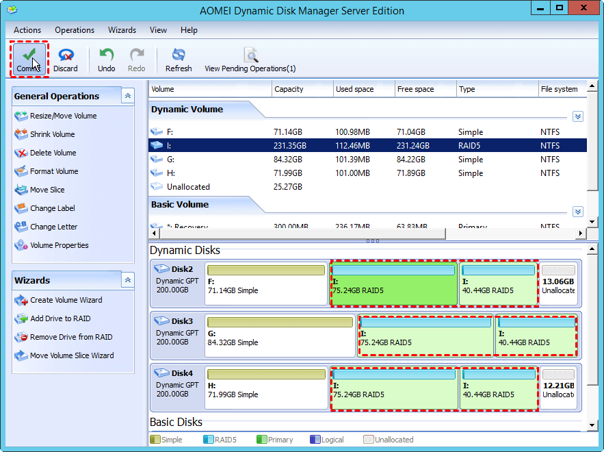 If the partition on the hardware RAID is in low disk space, you may want to rebuild the RAID hard drive with a larger one. In that case, you need to backup the data, delete all RAID partitions, recreate the RAID hard drive and restore the data again. Obviously, it is a time-consuming task and you may get you data lose in the process. To partition RAID safely and easily,the AOMEI Partition Assistant Server Edition is worth your trying. (PS.: the demo version allows you to simulate the operation).