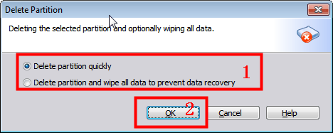 Step 2. You can choose if you need to completely wipe the data on the partition by overwriting it. Choose “Delete partition quickly” or “Delete partition and wipe data on it”.