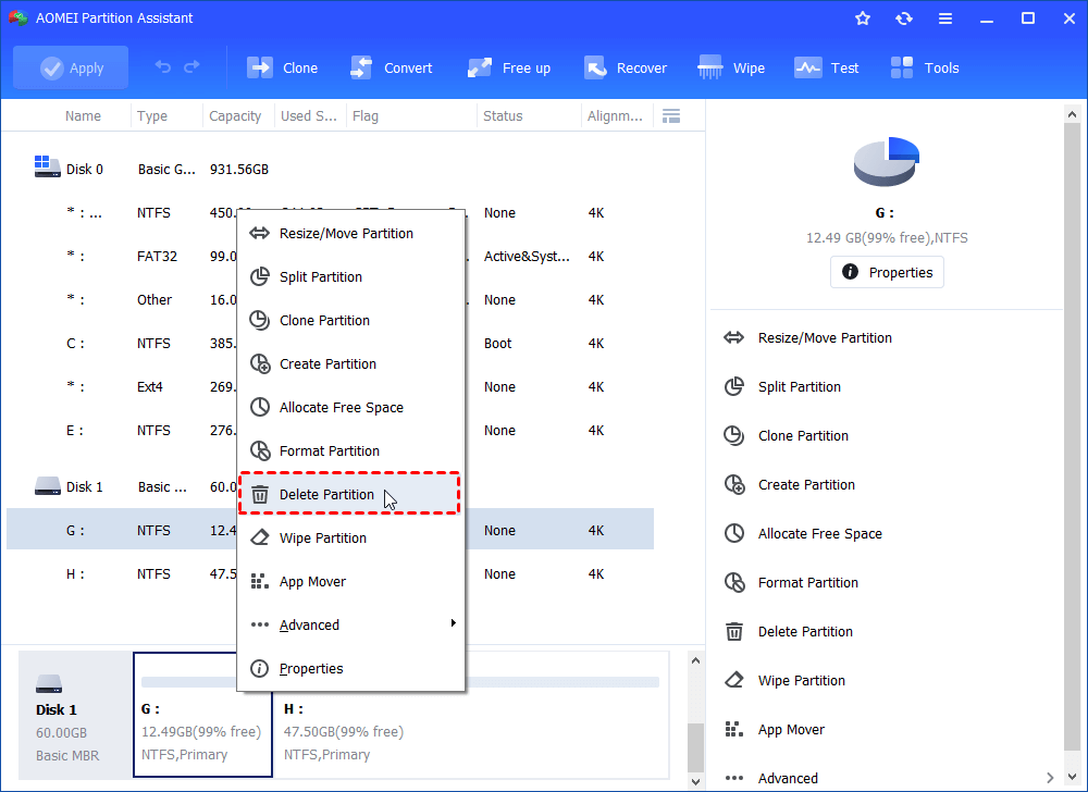 Step 1. Install and open AOMEI Partition Assistant, and locate the external hard drive, and choose a partition by right-clicking. And click “Delete Partition”.