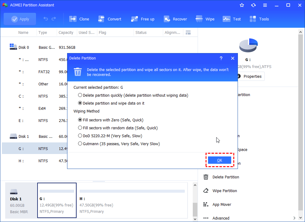 Step 2. Tick “Delete partition and wipe data on it”, and choose "Fill sectors with Zero". You can also upgrade to Professional edition to select other 3 wiping methods.