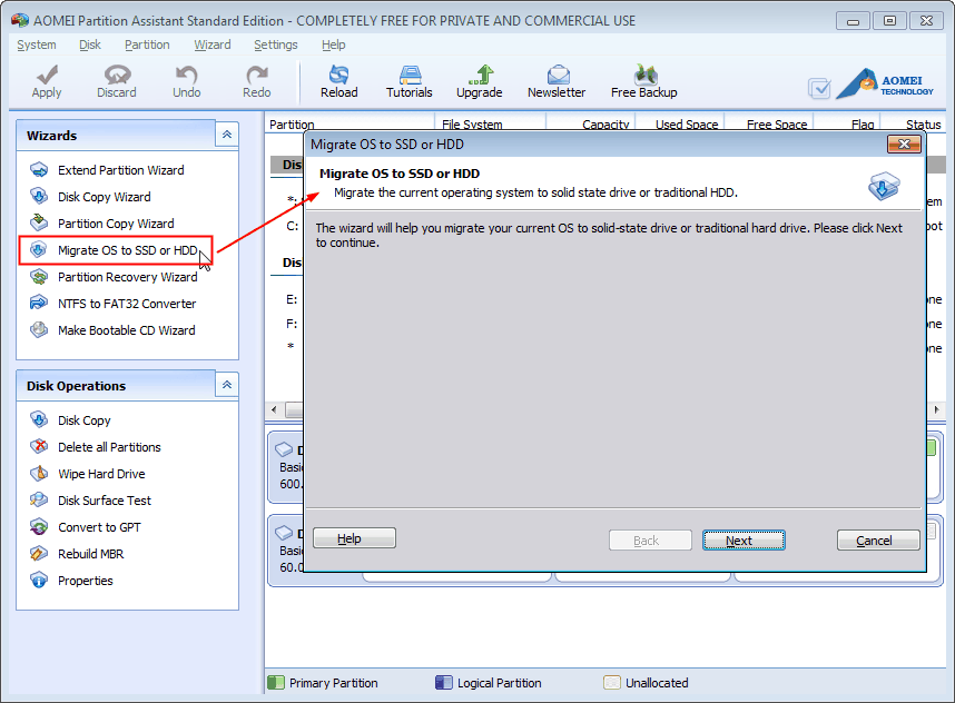 With AOMEI Partition Assistant, you can easily replace small C drive with SSD or HDD in Windows 11, 10, 8, and 7. The “migrate OS to SSD” option only moves the system partition and related data to the destination disk. If you want to migrate your other personal data, files, photos, or games, please use the “Clone Disk Wizard” feature. If you are using a Windows Server system, the Server version can help you.