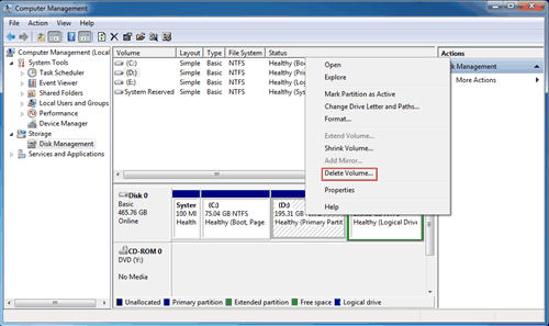 Step 1: In the following situation, D drive is the partition right behind C drive. Right click D drive and select "Delete Volume".