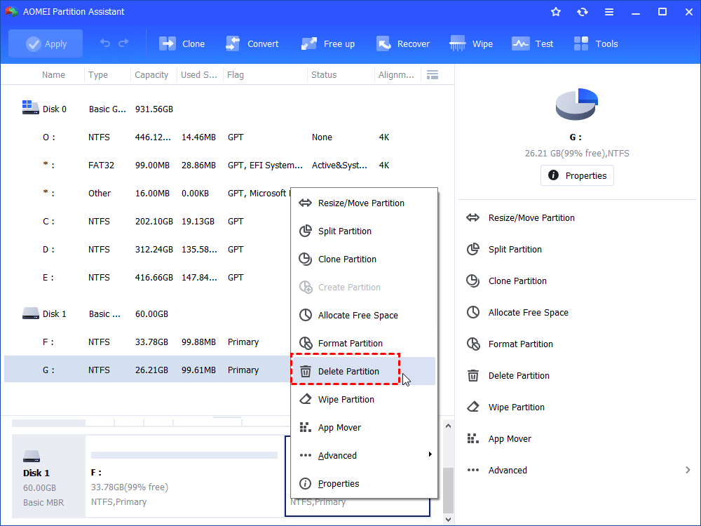 Step 1. Open the software, select the hidden logical partition and right click it. Press [Delete Partition], [OK] and [Apply] in serial.