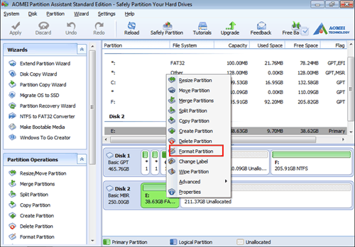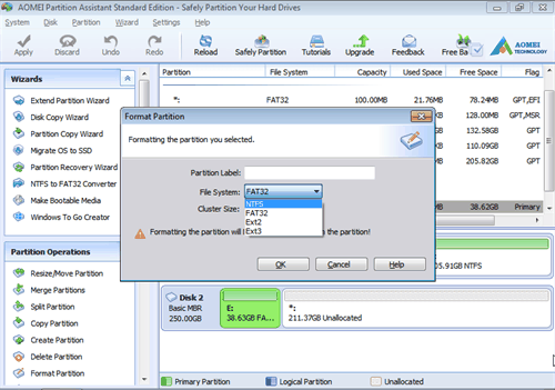 If you are not good at CMD command, you can turn to a powerful disk manager-AOEMI Partition Assistant Standard. It is a user-friendly software. you can easily format a USB drive, SD card, hard drive, as well as other storage device to full storage. And it supports FAT32, NTFS, exFAT, and Ext2, Ext3, Ext4 in Windows 10, 8, 7.