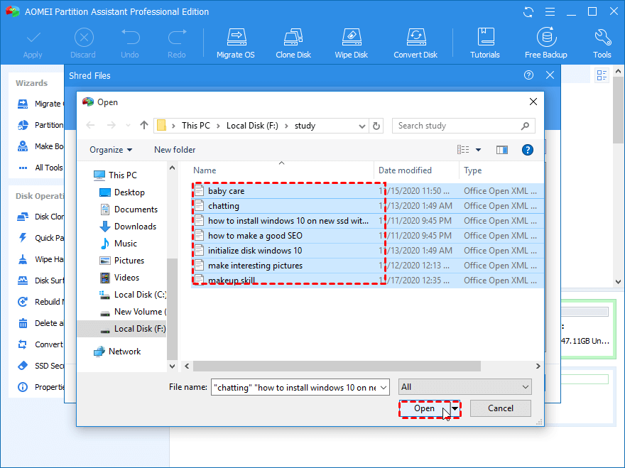 To shred files and overwrite them with random patterns, the easiest way is to make use a of professional file shredding tool, such as AOMEI Partition Assistant Professional. This software provides Windows users with 4 methods to shred unnecessary files: Write Zero, Random Data, DoD 5220.22-M and Gutmann.