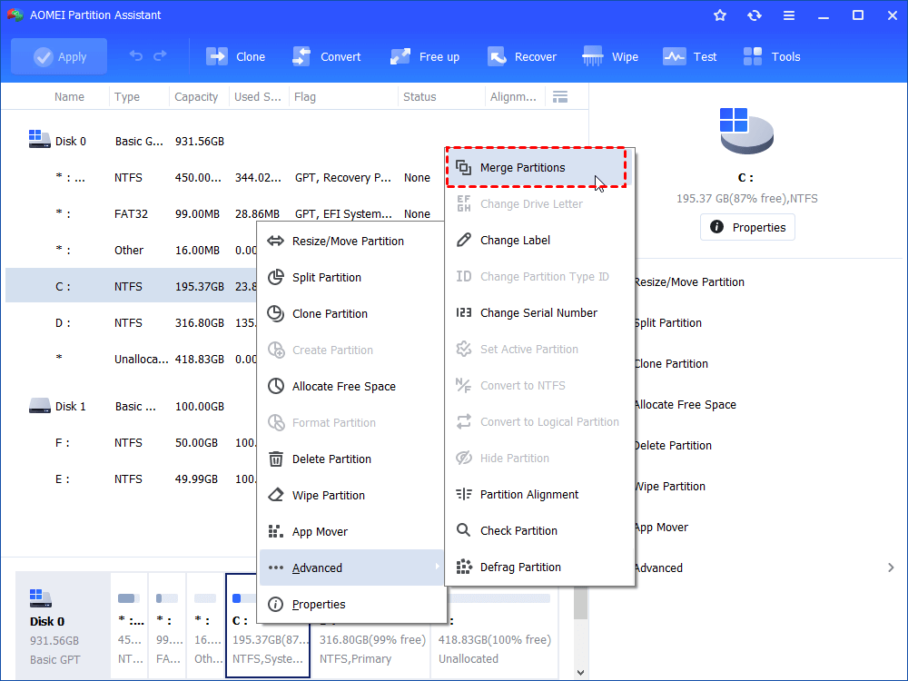 AOMEI Partition Assistant can help you do the task that the built-in tool can’t. Another way to make use of space in C drive is to create partition in C drive directly. Except for shrinking C drive to more than half space, you can use it to move partition, merge partitions, copy disk, convert system disk from MBR to GPT disk for Windows 11, and more advanced function, command line partition.