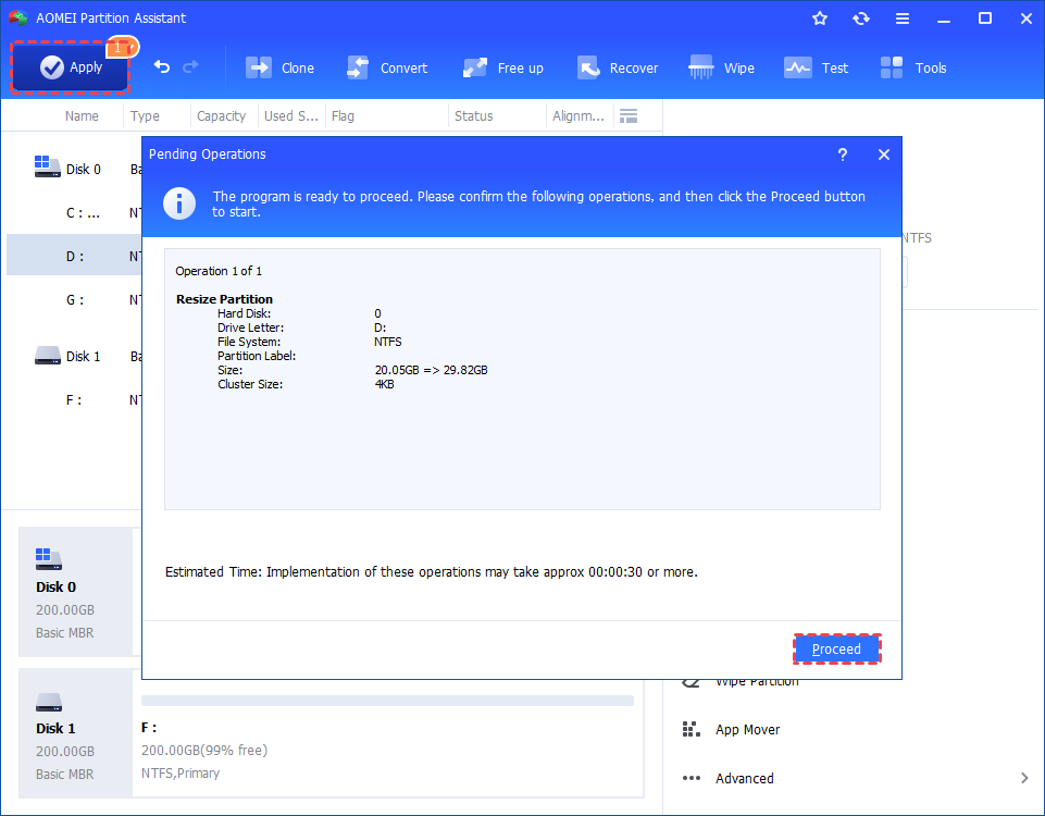 Step 3. You can preview the operation by viewing the "Pending Operations". To commit the "Pending Operations", please click "Apply" and "Proceed".