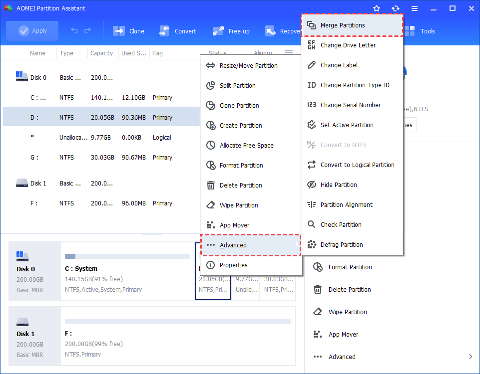 Step 1. Install and launch AOMEI Partition Assistant. In this example, there is an unallocated space behind D: partition. Right-click the partition (here is D:) where you want to merge unallocated space to and click "Advanced" and then select the "Merge Partitions" feature in the drop-down menu.