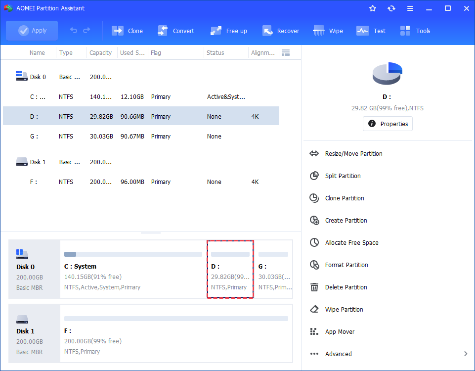 For a simple and beginner-friendly option, AOMEI Partition Assistant is highly recommended. It also offers many other powerful features to help you manage disks and partitions better, including resizing/moving partitions, converting MBR to GPT, cloning larger drive to smaller drive, and so on.