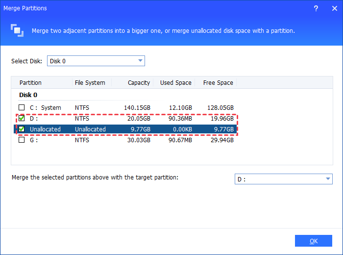 Step 2. In the pop-up window, tick the check boxes of which are in front of the partition and the unallocated space, and then click "OK" to continue. In this case, you cannot specify the target partition because D: is selected as the target partition in default and there is no other choice.