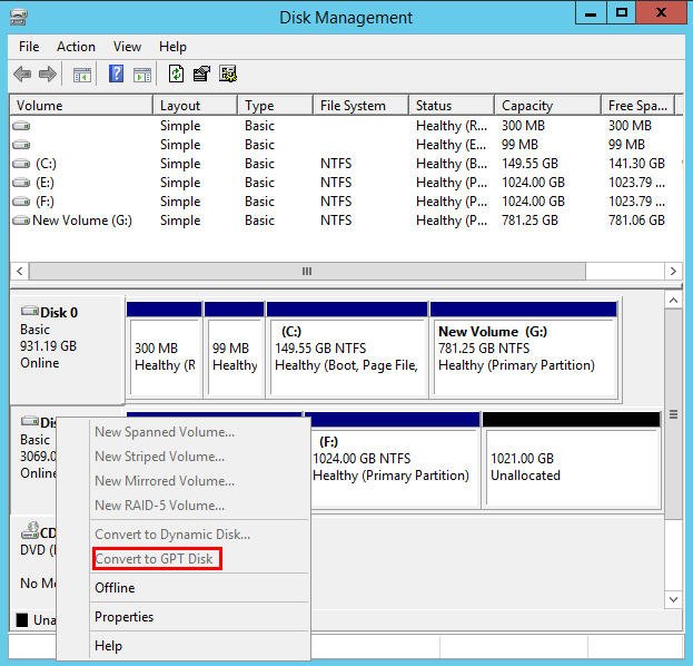 “I have Windows Server 2012 R2 installed on my machine and I want to convert my 3TB external hard drive to GPT so that I can make full use of it. But I found the option of 'Convert to GPT Disk' greyed out when I tried to change my hard drive from MBR to GPT partition style via Disk Management.