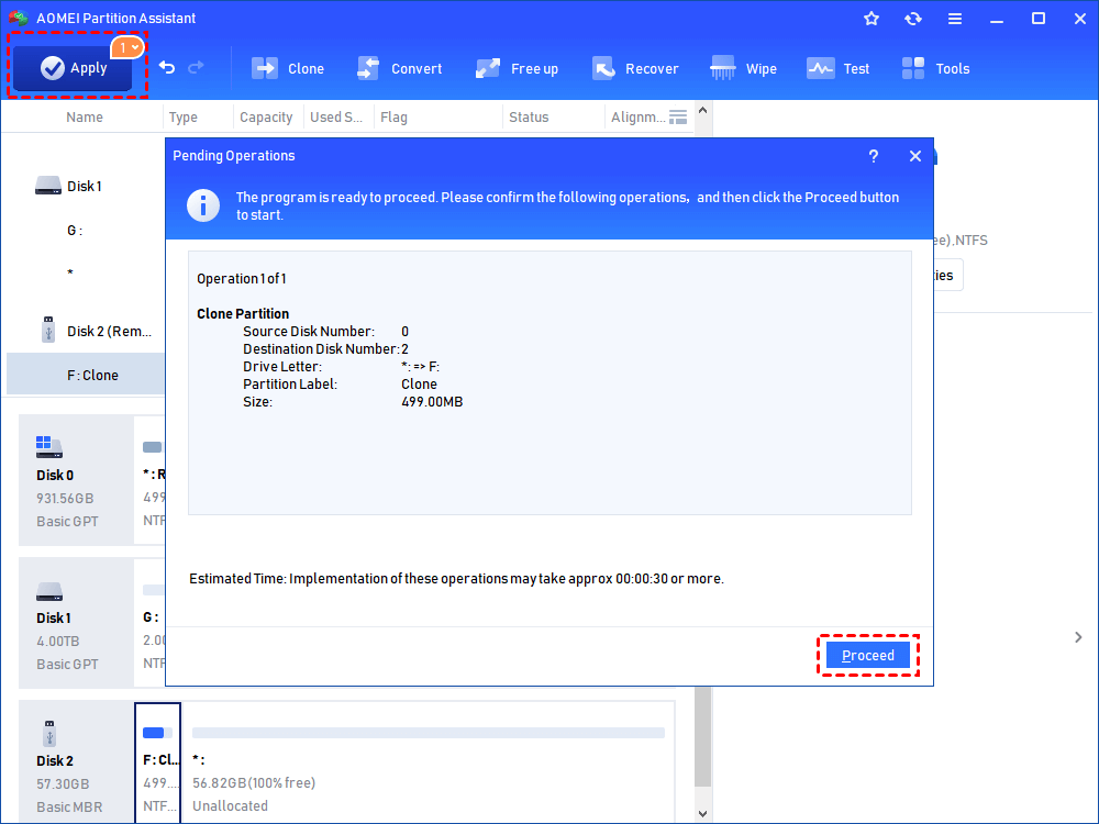 Step 5. You can preview the partition copy operating by viewing the "Pending Operations". To commit the "Pending Operations", please click "Apply" and "Proceed".