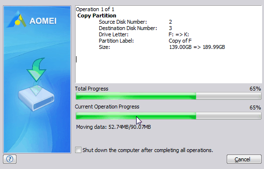 The cloning process will start and you can check the cloning process. Once the process is completed successfully, you will get a congratulation window. Finally, you can check the partition layout on the destination disk will be identical to the source partition.