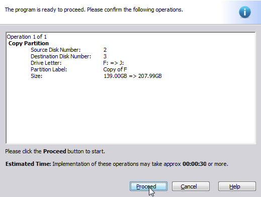 Step 5. You can preview the partition copy operating by viewing the "Pending Operations". To commit the "Pending Operations", please click "Apply" and "Proceed".