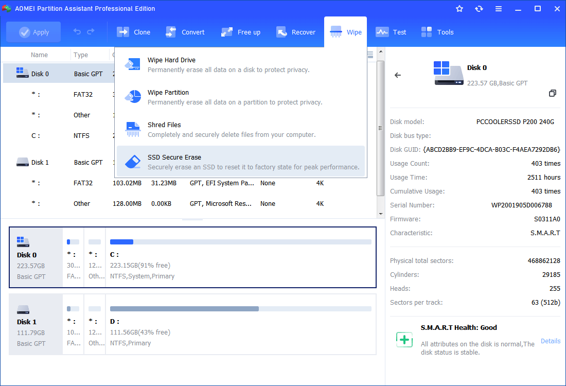 Step 1. Open this tool, click “Wipe” in the right menu, and choose “SSD Secure Erase”.
