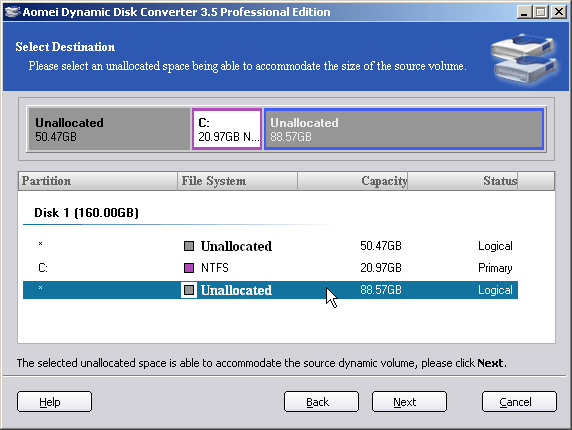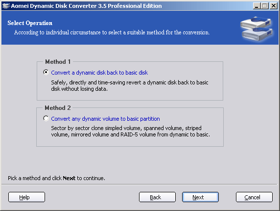 ● When you get into AOMEI Dynamic Disk Converter, you can choose a way to convert dynamic disk or dynamic volume to a basic one. Here we select the first one.