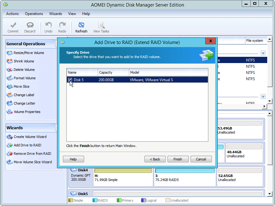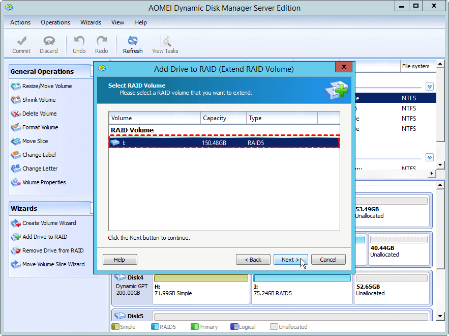 Here we recommend using AOMEI Partition Assistant Server. It has a great dynamic disk manager to help users to manage dynamic disk and volumes (including expanding RAID 5 volume) easily and safely. It provides you with two methods to enlarge RAID 5 volume for different situations (whether there is free space in all other virtual drives on the RAID 5 array or not).