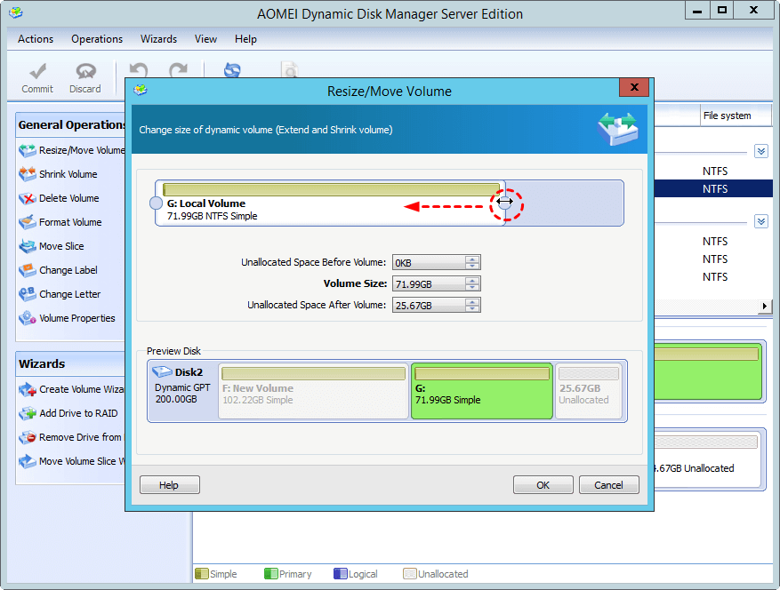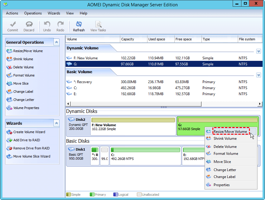 Step 1. Launch AOMEI Partition Assistant Server, click “Dynamic Disk Manager” in the right menu. In the pop-out window, right-click G: volume, and then select “Resize/Move Volume” in order to generate unallocated space.