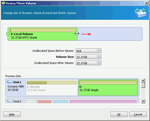 Step 3. If we want to extend simple volume I: with spanned volume. We can right-click I: simple volume and choose the “Resize/Move Volume” option to get the new operating Window, drag the size you want to extend.(If there is no unallocated space on another dynamic disk, you can delete some volumes with more free space to obtain unallocated space.)