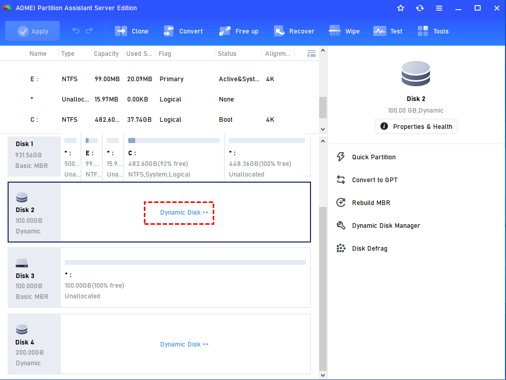 AOMEI Partition Assistant Server is a professional dynamic disk management software that supports Windows 11/10/8/7 and is suitable for rookies. It can help you manage dynamic disks and extend/shrink/move/format/delete volumes easily.