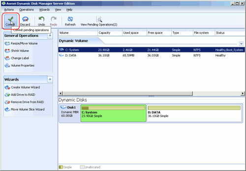 All operations should be performed under Reboot Mode. After your system reboots, navigate to Disk Management and you’ll find the unallocated space has been merged into the system drive on dynamic disk successfully.
