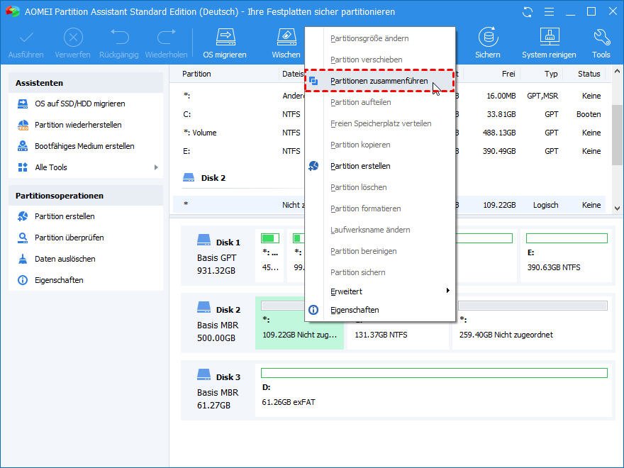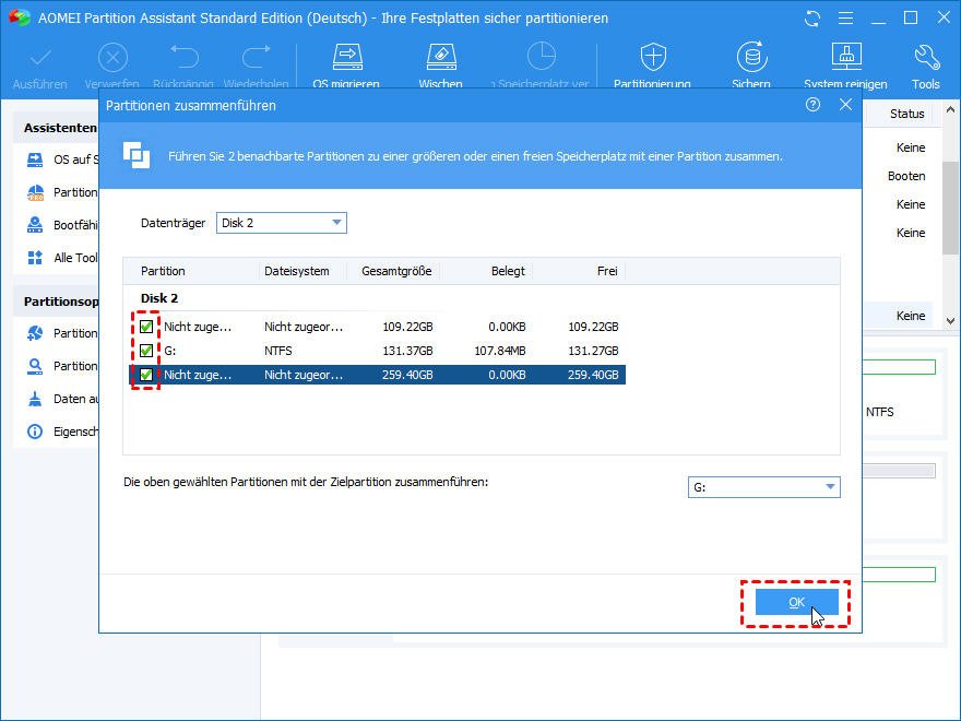 2 nicht zugeordnete Partitionen zusammenführen durch AOMEI Partition Assistant in Windows 10, 11