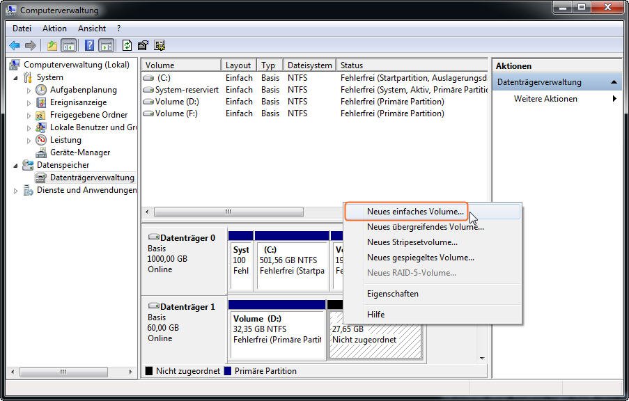 Als Nächstes klicken Sie mit der rechten Maustaste auf die zusammengeführte Partition, und wählen Sie dann „Neues einfaches Volume“, dann wird eine neue Partition erstellt. Schließlich können Sie das Backup-Image bei Bedarf auf der neuen Partition wiederherstellen.