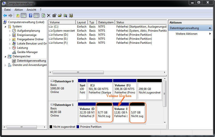 Im Allgemeinen gibt es einen Umweg, um 2 zugeordnete Partitionen zusammenzuführen. Um genau zu sein, sichern Sie zunächst die Partition mit Partitionssicherungssoftware, die sich zwischen zwei nicht zugewiesenen Speicherplatz befindet. Löschen Sie es dann mit „Volume löschen“. Die Partition wird nicht zugeordneten Speicherplatz werden. Dann werden die vorher und nachher nicht zugeordnete Partitionen automatisch zusammengeführt.