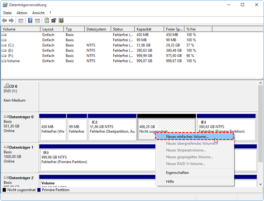 Schritt 2. Klicken Sie mit der rechten Maustaste auf den nicht zugewiesenen Speicherplatz und wählen Sie „Neues einfaches Volume“ aus dem Kontextmenü. Folgen Sie dem Assistenten, und klicken Sie auf „Weiter“.