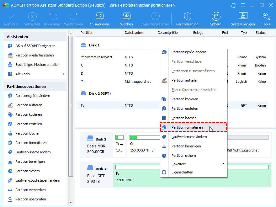 Um diesen Vorgang abzuschließen, können Sie sich an AOMEI Partition Assistant Standard wenden, einen guten Partition-Manager, der Ihre Festplatte sicher und schnell partitionieren kann. Es hilft Ihnen, eine externe oder interne Festplatte auf FAT32, exFAT, NTFS und andere Dateisysteme zu formatieren.