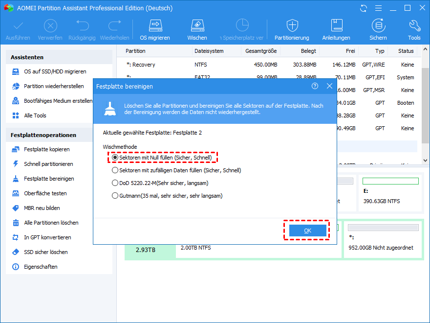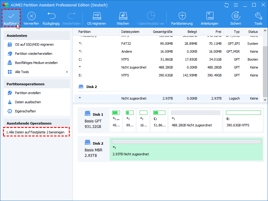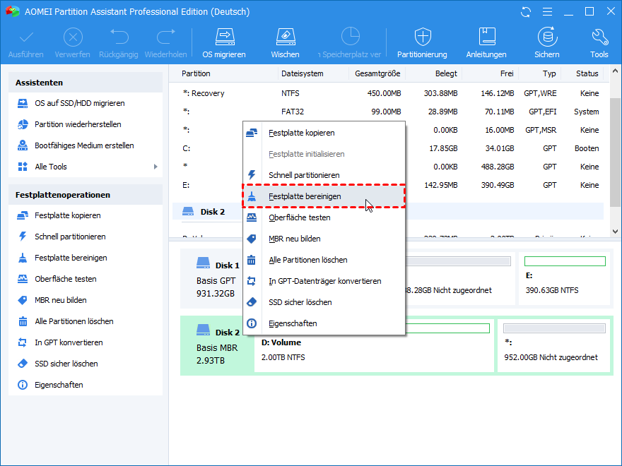 Als Computervirus wird empfohlen, die externe Festplatte zu reinigen. Sie können sich auf die Schritte in „Methode B“ beziehen, um die 3 TB Festplatte in Diskpart zu bereinigen, oder Sie können die 3 TB HDD vollständig und dauerhaft mit dem oben genannten AOMEI Partition Assistant bereinigen.