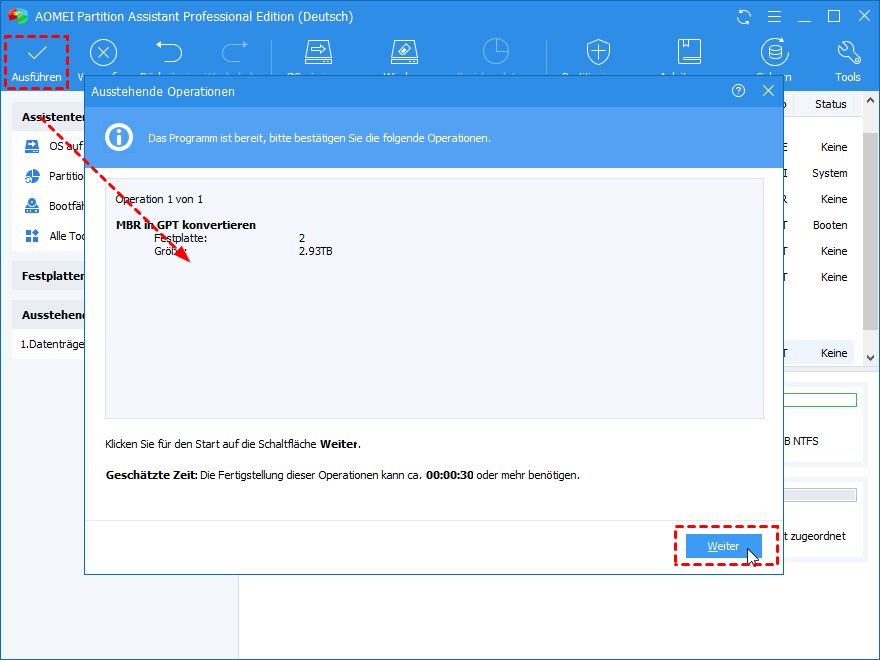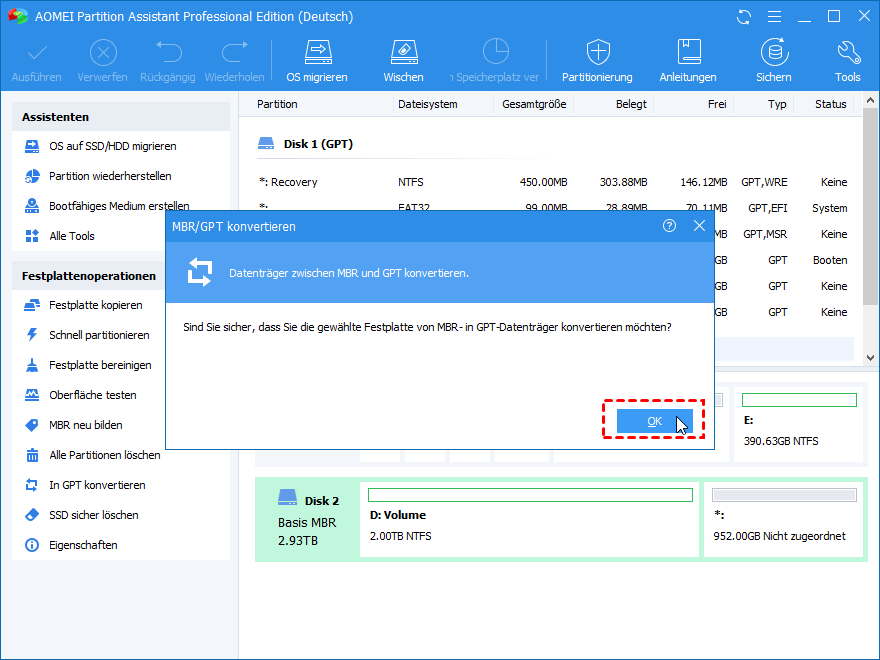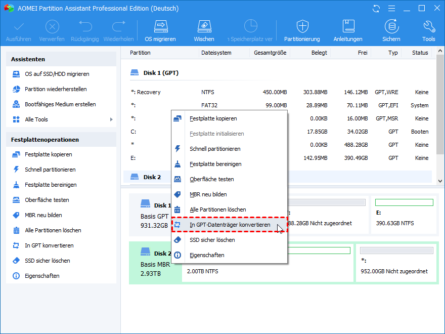 Tipp: Mit AOMEI Partition Assistant können Sie auch Systemdatenträger von MBR in GPT ohne Datenverlust konvertieren.