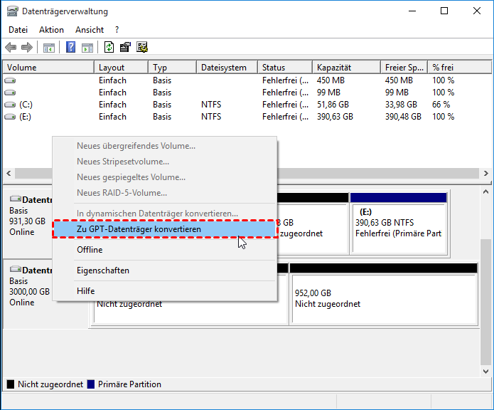 Wenn Sie die 3 TB Festplatte bei der ersten Verwendung mit einem falschen Partitionsschema initialisiert haben, machen Sie sich keine Sorgen. Windows bietet die Möglichkeit, um das Partitionsschema auf das richtige zu ändern.