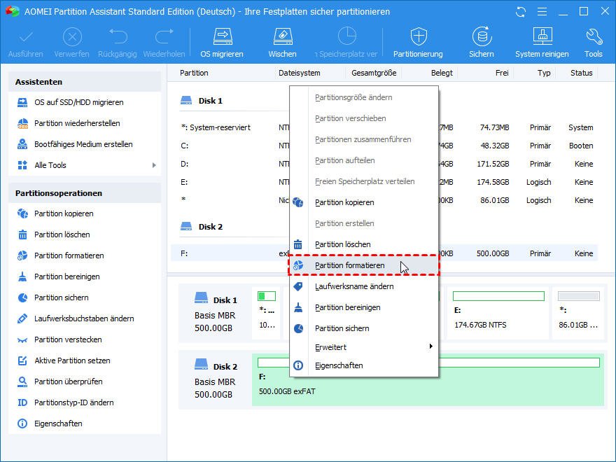 In diesem Fall wird AOMEI Partition Assistant dringend empfohlen. Es isr ein FAT32 USB Formatter, der die Beschränkung von 32GB bricht und ermöglicht, 64GB, 128GB oder noch größere USB-Sticks mit dem FAT32-Dateisystem zu formatieren.