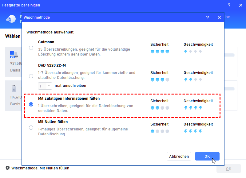 Festplatte bereinigen: Wenn Ihr Laptop mit einer Festplatte installiert ist, kann Ihnen diese Funktion mit 4 Methoden helfen, einschließlich Füllen der Sektoren mit zufälligen Daten, DoD 5220.22-M, Gutmann und Füllen der Sektoren mit Null.