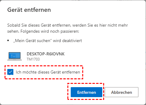 Schritt 3. Klicken Sie auf Dateils anzeigen > Support > Gerät entfernen > Ich möchte dieses Gerät entfernen" und klicken Sie dann auf "Entfernen".