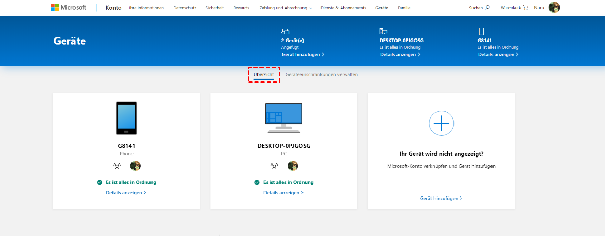 Schritt 2. Klicken Sie auf Geräte > Übersicht, um die mit dem Konto verknüpften Geräte anzuzeigen, und wählen Sie den PC aus, den Sie deaktivieren möchten.
