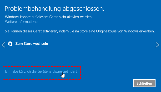 Schritt 4. Wählen Sie die Schaltfläche Start, dann Einstellungen > System > Aktivierung > Problebehandlung. Öffnen Sie die Aktivierungseinstellungen und wählen Sie Ich habe kürzlich die Gerätehardware geändert und klicken Sie dann auf Weiter.