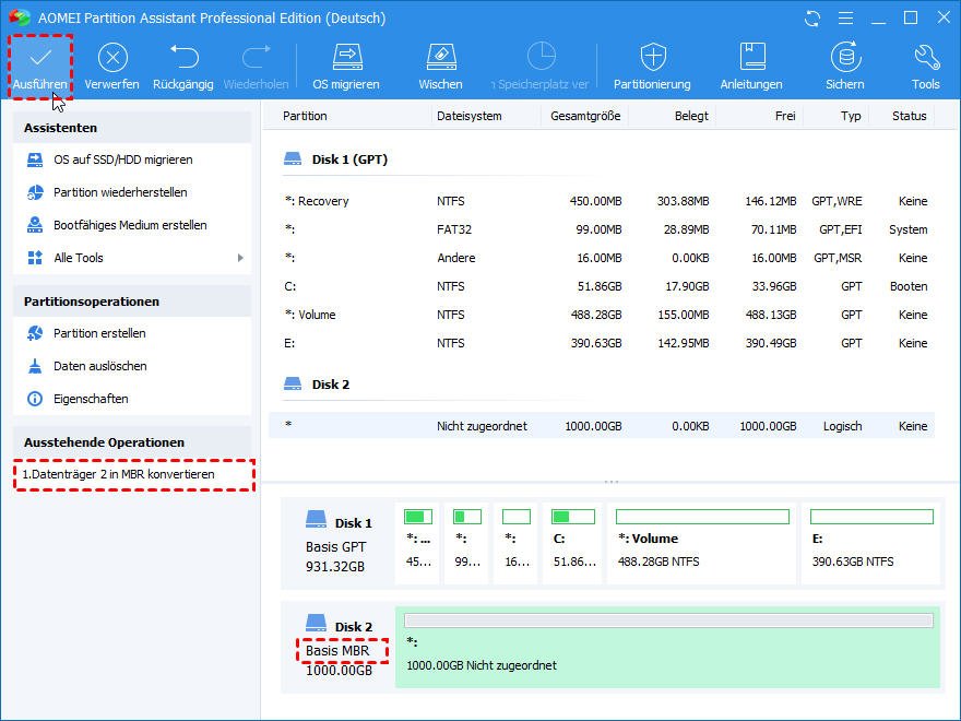 IV. Jetzt können Sie finden, dass der GPT-Datenträger schon in MBR-Datenträger umwandelt ist, aber Sie müssen auf „Ausführen“ klicken, um die Operation zu bestätigen.