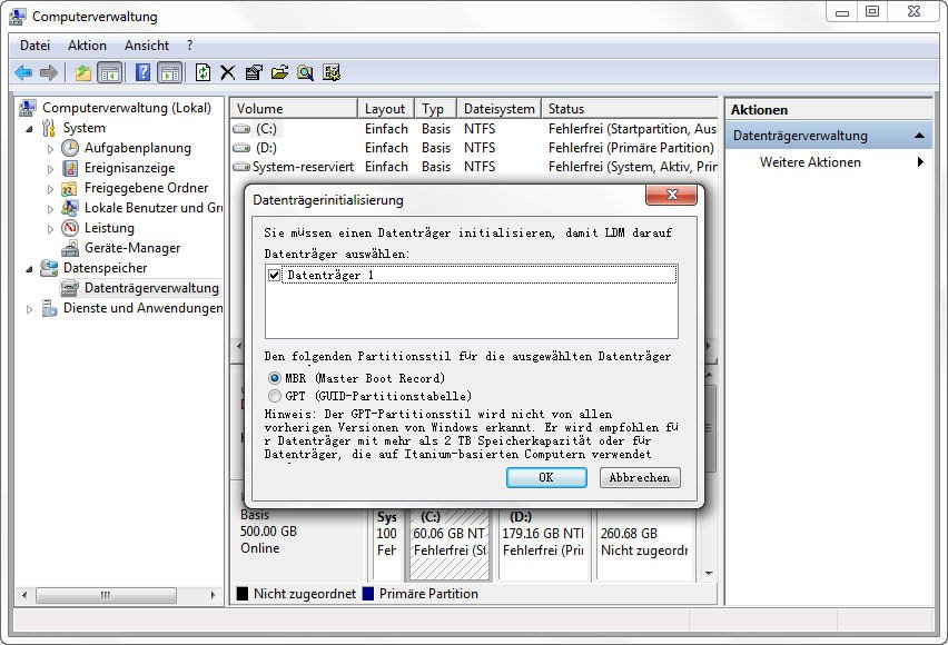 Schritt 2. Aktivieren Sie in dem Fenster Datenträgerinitialisierung das Kontrollkästchen Datenträger 1 (die Festplatte ist nicht initialisiert), wählen Sie einen Partitionsstil (GPT oder MBR) und klicken Sie auf OK, um die ausstehende Operation zu starten. Wenn dieses Fenster nicht angezeigt wird, rechtsklicken Sie auf den nicht initialisierten Datenträger, und wählen Sie Datenträgerinitialisierung aus.