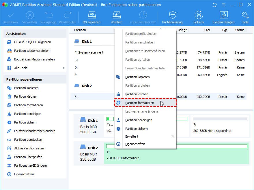 Wenn Sie mit der Eingabeaufforderung nicht vertraut sind, können Sie den kostenlosen Partitionsmanager AOMEI Partition Assistant ausprobieren. Damit können Sie problemlos RAW in NTFS formatieren. Alle Schritte sind fest und es gibt kaum die Chance, einen Fehler zu machen.