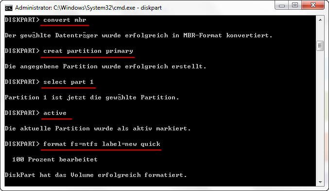format fs=ntfs label=new quick (new ist die Datenträgerbezeichnung und Sie können sie durch einen gewünschten Name ersetzen)