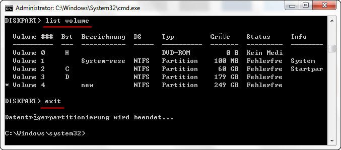 list volume (Sie sollten eine mit NTFS formatierte Partition sehen können)