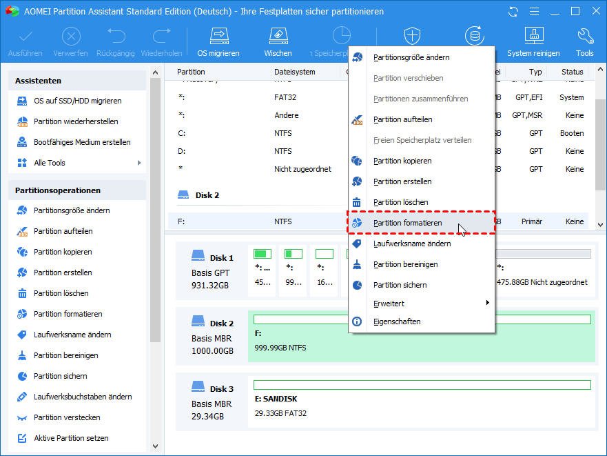 II. Klicken Sie mit der rechten Maustaste auf die externe Festplatte mit 1 TB im Hauptfenster, und wählen Sie die Option „Partition formatieren“ im Dropdown-Menü aus.