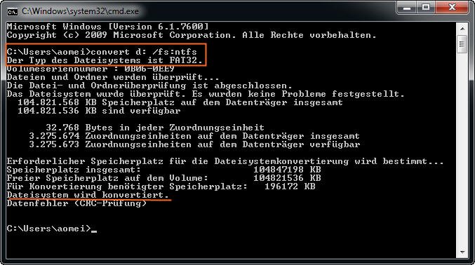 Wenn Sie den Fehler beheben möchten, dass die Datei für das Zieldateisystem ohne Formatierung zu groß ist, können Sie die externe Festplatte FAT32 in NTFS konvertieren, ohne Daten zu verlieren. Hier finden Sie zwei Möglichkeiten, um FAT32 in NTFS zu konvertieren.