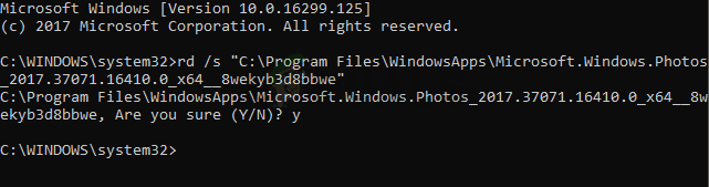 Schritt 9. Geben Sie bitte rd/s "C:\ProgramFiles\WindowsApps\Microsoft.Windows.Photos_2017.37071.16410.0_x64__8wekyb3d8bbwe" ein und drücken Sie die Eingabetaste.